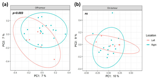 A total of 4.4 million reads (an average of 109,122 reads/sample) were obtained following quality control, a sampling depth of 8000 reads/sample was chosen following rarefaction. Comparison of alpha diversity metrics shows that the off-tumor microbiota of patients with right-sided colorectal cancer showed significantly greater ACE (Bacterial Abundance), Observed OTUs (Species Richness), and Chao1 (Bacterial Diversity), compared to left-sided colorectal cancer patients (Figure 2; p < 0.05). Consistent with this, the Jaccard similarity assessed beta diversity, showing that the off-tumor microbiota of right- and left-sided colorectal cancer patients formed significantly distinct bacterial community clusters (Figure 3a; p = 0.003). In contrast, the on-tumor microbiota showed no differences in alpha diversity between right- and left-sided colorectal cancer patients (Figure 2; ns). Furthermore, no significant differences in beta diversity were observed between right- and left-sided colorectal tumors (Figure 3b; ns). Collectively this suggests that bacterial diversity is greater in the right colon compared to the left; however, the presence of a colonic tumor leads to a more consistent bacterial diversity between locations.