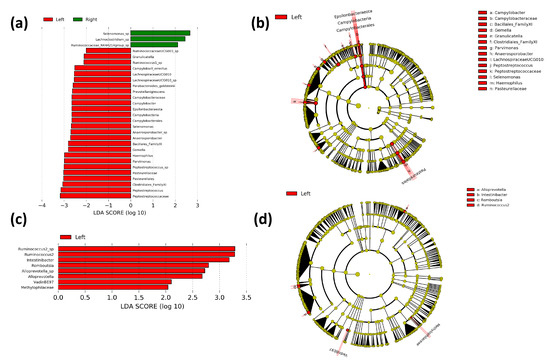Differences in gut bacterial populations between right- and left-sided colorectal cancer patients were assessed using LEfSe to determine bacterial taxa that are significantly enriched between locations. The off-tumor microbiota of right-sided colorectal cancer patients showed greater abundances of species of the Lachnoclostridium, Selenomonas, and Ruminococcus genera. Whereas, the off-tumor microbiota of left-sided colorectal cancer patients is enriched with Epsilonbacteraeota phylum, Campylobacteria class, Pasteurellales and Campylobacterales orders, Campylobacteraceae, Bacillales Family XI, Clostridiales Family XI, Peptostreptococcaceae and Pasteurellaceae families, and Campylobacter, Gemella, Granulicatella, Parvimonas, Anaerosporobacter, Lachnospiraceae (UCG010), Peptostreptococcus, Selenomonas, and Haemophilus genera (Figure 5a,b). The on-tumor microbiota of left-sided cancer patients showed greater abundances of Methylophilaceae and Vadin BE97 families and Alloprevotella, Intestinibacter, Romboutsia, and Ruminococcus 2 genera, compared to right-sided colorectal cancer patients (Figure 5c,d). Collectively, these results support the diversity data, with the off-tumor microbiota showing large differences in bacterial populations between the right and left colon. In contrast, the on-tumor microbiota seems less affected by location, supporting a cancer-defined microbiota that is more constant between the right and left colon.