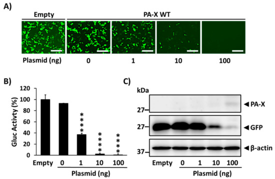 Ability of 1918 PA-X to inhibit host gene expression: HEK293T cells were co-transfected with increasing concentrations (0, 1, 10, or 100 ng/well) of a pCAGGS expression plasmid encoding wild-type 1918 PA-X (PA-X wild-type, WT) fused to an HA epitope tag, and 250 ng of pCAGGS-Gluc and -GFP plasmids. Empty plasmid transfected cells were included as controls. At 24 h p.t., GFP was observed under a fluorescence microscope (A), and Gluc activity was quantified using a GloMax system from cell culture supernatants (B). Gluc activity was normalized to empty plasmid transfected cells (100%). **** p < 0.0001; (0 ng of PA-X WT plasmid versus other concentrations) using one-way ANOVA and Dunnett’s test for multiple comparison correction. The presence of PA-X and GFP in cell lysates was analyzed by Western blot using anti-HA or anti-GFP PAbs, respectively (C). β-actin was used as a loading control. Results are the means and SDs of triplicates. Data are representative of three separate experiments. Magnification 20×, scale bar, 100 µm.