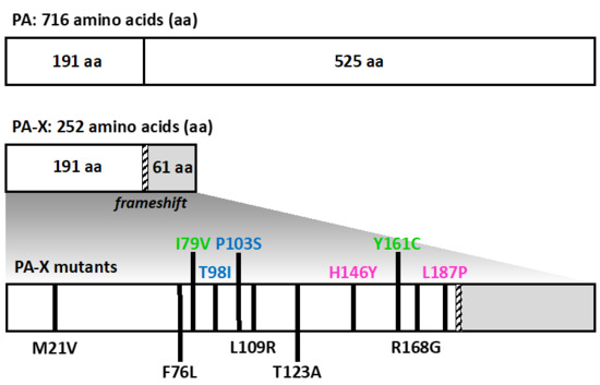 - Hayashi, T.; Chaimayo, C.; McGuinness, J.; Takimoto, T. Critical Role of the PA-X C-Terminal Domain of Influenza A Virus in Its Subcellular Localization and Shutoff Activity. J. Virol. 2016, 90, 7131–7141. [Google Scholar] [CrossRef]