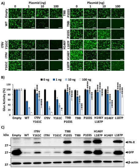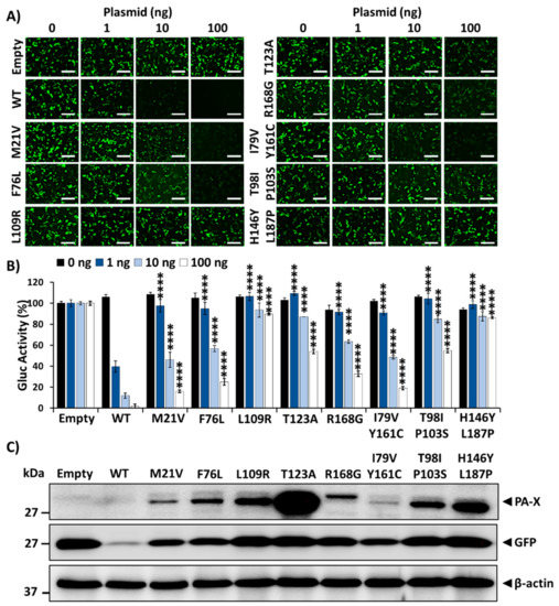 Upon sequencing of pBGKT7 plasmids containing the PA-X gene from the recovered bacteria, several mutations were identified, suggesting their importance for host shutoff activity. To investigate this, we assessed the ability of the identified 1918 PA-X mutants to inhibit host gene expression and compared them to that of the WT 1918 PA-X (Figure 3). Each of the 1918 PA-X mutants displayed weakened, albeit varying degrees, inhibition of host gene expression compared to WT 1918 PA-X, as indicated by GFP expression (Figure 3A) and Gluc activity (Figure 3B). Notably, PA-X mutations L109R, T123A, T98I/P103S, and H146Y/L187P had a greater impact on PA-X’s ability to suppress host gene expression (Figure 3A,B). These results were further validated by Western blot analysis (Figure 3C) because of the ability of 1918 PA-X to inhibit its own expression when expressed under the control of an RNA polymerase II promoter [13]. As expected, all 1918 PA-X mutants were expressed to higher levels than 1918 WT PA-X (Figure 3C). Similarly, GFP and Gluc expression levels were higher in cells transfected with 1918 PA-X mutants (Figure 3A,B), predominantly L109R, T123A, T98I/P103S, and H146Y/L187P, whose inhibitory activity is greatly affected. Surprisingly, PA-X containing a T123A amino acid change showed the highest expression levels by Western blot (Figure 3C). Although the reason(s) for these differences were not directly addressed, it could be due to protein stability. Recently, it was described that the half-life of PA-X ranges from ~30 min to ~3.5 h depending on the IAV strain [33]. Notably, sequences in the C- and N-terminal domains were important for regulating PA-X half-life [33].