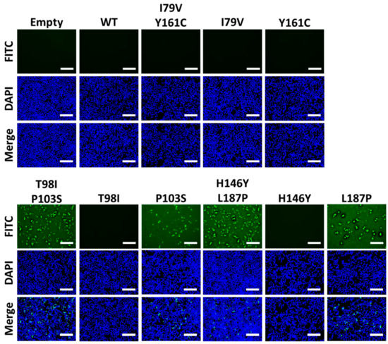 Lastly, 1918 PA-X double and single mutants were evaluated by immunofluorescence, which displayed no signal for WT, I79C/Y161C, or its single mutants I79V or Y161C (Figure 6). However, double mutants T98I/P103S andH146Y/L187P, along with their single mutant P103S and L187P, were detectable in these immunofluorescence assay (Figure 6). Overall, these results demonstrate that the combination of I79V and Y161C are both important for affecting PA-X’s ability to inhibit host gene expression. However, in the case of double mutants T98I/P103S and H146Y/L187P, P103S and L187P are mainly responsible for the lack of host shutoff activity of 1918 PA-X, although this inhibition is enhanced by T98I and H146Y, respectively.