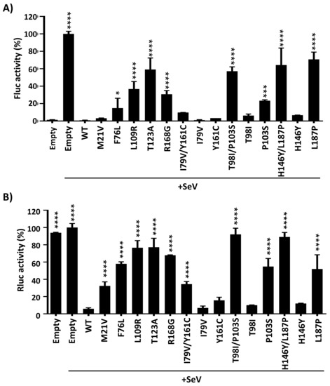 To analyze the effect of the amino acid changes identified in modulating innate immune responses, we used a well-established virus-based assay. To this end, HEK293T cells were co-transfected with pCAGGS plasmids expressing 1918 PA-X WT or mutants, together with a plasmid expressing Fluc under the control of an ISRE promoter (Figure 7A) and a plasmid constitutively expressing Rluc (SV40-Rluc) to evaluate shutoff activity (Figure 7B). At 24 h p.t., cells were mock-infected or infected (MOI of 3) with SeV and reporter expression levels were evaluated at 21 h p.i. by measuring expression levels of Fluc (Figure 7A) and Rluc (Figure 7B). In cells transfected with empty plasmid, SeV infection induced high levels of Fluc expression driven by the ISRE promoter (Figure 7A). However, activation of ISRE promoter in cells transfected with 1918 PA-X proteins was significantly reduced (Figure 7A). Interestingly, 1918 PA-X mutants inhibiting ISRE promoter activation to higher extents (L109R, T123A, R168G, T98I/P103S, and H146Y/L187P) were the ones showing higher shutoff activity. In addition, shutoff activity for 1918 PA-X WT or the identified mutants, measured by Rluc levels (Figure 7B), showed similar results compared to those previously described (Figure 3), indicating a positive correlation between 1918 PA-X’s ability to inhibit host gene expression and blocking IFN responses.