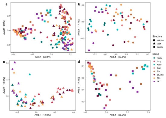 Weighted UniFrac principal coordinate analysis (PCoA) of microbial communities. Analysis plots of (a) all structures from all locations combined, (b) vesicles from all locations, (c) leaves from all locations, and (d) holdfasts from all locations.