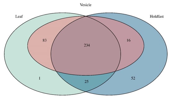 Barplots of diversity show that the holdfast is most distinct in terms of community composition when compared to the leaves and vesicles. The holdfast is dominated by the phylum Proteobacteria, while leaves and vesicles have a more even composition of Actinobacteriota, Bacteroidota, Cyanobacteria, Firmicutes, and Proteobacteria (Figure 3). The uniqueness of the holdfast remains at the levels of class, order, and family, whereas the leaves and vesicles have communities that are similar in composition (Figures S2–S4). Similarly, the Venn diagram shows that the holdfast has the highest number of unique ASVs of all three structures, whereas the highest number of shared ASVs is found between the leaves and vesicles at 83 ASVs; in total, 234 ASVs are shared between all three structures (Figure 4). Plots of diversity show that leaves and vesicles contain a similar level of diversity and are not significantly different from each other (p > 0.05), while the holdfast is significantly different from the leaves and vesicles (p < 0.01) and contains the lowest diversity. Diversity at all islands is similar and not significantly different between any pairwise comparisons (p > 0.05) (Figures S5 and S6; see Table S3 for diversity metrics of each individual sample and Table S4 for details of ASV abundance and assigned taxonomy).