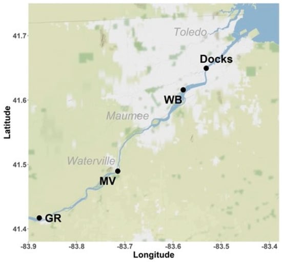 Four sites were chosen, beginning upstream of Lake Erie. The sites sampled, upstream to downstream are Grand Rapids (GR; 41.416944, −83.8775), Miltonville (MV; 41.48972, −83.71472), Walbridge Park (WB; 41.61583, −83.57889) and the Docks (41.64944, −83.5311) (Figure 1). The Grand Rapids site is in a rural area and receives runoff from agricultural land. Miltonville is a suburban site directly across the river from the town of Waterville, OH and the Lucas County Wastewater Treatment Plant (LC-WWTP). The Walbridge Park and Docks sites are both located within the city of Toledo, OH and are affected by urban stormwater runoff and industrial inputs. The Docks site lies 3 km upstream from the mouth of the river at Lake Erie. At the sites, water temperatures ranged between 1 °C (December 2017) and 4 °C (November 2017) in the cooler months (USGS Gage 04193490, Waterville, OH, USA). During the warmer months, the daytime river temperature in May 2017 was 15 °C, and the June and July temperatures were 22 °C and 24 °C, respectively (USGS Gage 04193490). Surface water samples were collected in sterile polycarbonate bottles from each of the four sites described above in 2016 (1st October, 12th November, 3rd December) and 2017 (25th May, 6th and 14th June, 6th and 24th July). Due to extreme cold conditions and partial freezing of the river during winter months, sampling was paused during winter. Samples were transported to the Bowling Green State University (Bowling Green, OH, USA) lab under ice, and immediately processed for E. coli enumeration and isolation.