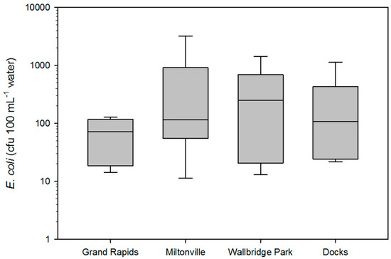 Box plot displaying E. coli cfu 100 mL−1 of water sample within the four sites across all sampling events. The line within each box indicates the median value. The whiskers above and below the box indicate the maximum and minimum values of E. coli load within the four sites.