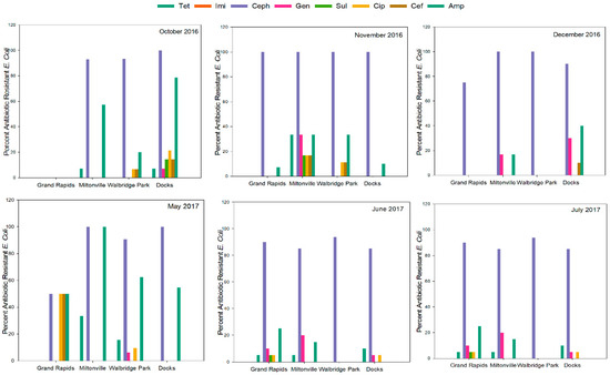 Percentage of antimicrobial resistance (AMR) within E. coli isolates in the four sites across all sampling events. Tet—Tetracycline, Ceph—Cephalothin, Sul—Sulfamethoxazole, Cef—Cefoperazone, Amp—Ampicillin, Cip—Ciprofloxacin, Gen—Gentamicin, Imi—Imipenem.