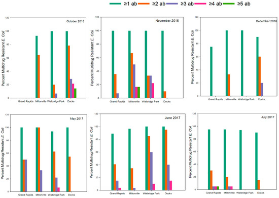 One of the most striking findings in this study was that 313 out of the 329 E. coli isolates (95%) was found to be resistant to at least one antibiotic (Table 3), primarily associated with cephalothin and ampicillin, two β-lactam drugs. Presence of MDR (resistance to ≥2 antibiotics) was also noted to be high in all sites tested—144 out of the 329 (43%) of the isolates belonging to the ≥2 antibiotics category and 50 isolates (15%) belonging to the ≥3 antibiotics category. As stated, β-lactam drugs drove the majority of the MDR. On an average across all sampling events (including the colder months), the highest MDR incidence was observed in the downstream sites compared to the upstream sites: Walbridge Park (44.3% isolates resistant to ≥2 antibiotics) and Docks (54.1% isolates resistant to ≥2 antibiotics) in contrast to Grand Rapids (33.3% isolates resistant to ≥2 antibiotics) and Miltonville (41% isolates resistant to ≥2 antibiotics). Of these, 6.2% from Walbridge Park and 6% from Docks were found to resistant to ≥4 different antibiotics across all sampling events (Table 3). However, site had no statistical influence on MDR to ≥2 or ≥4 antibiotics (p > 0.05). Interestingly, sample month had little influence on MDR to ≥2 or ≥4 antibiotics. Post-hoc pairwise comparisons of MDR to ≥2 antibiotics showed that MDR isolates only from July were statistically different from those collected in June and Oct., respectively (p < 0.001). Except for the colder months of December, we found isolates that are resistant to ≥4 antimicrobial agents in all other months, mostly in the three downstream sampling sites of Miltonville, Walbridge Park and Docks (Figure 4). Notably, 22.2% (November ’16), 6.2% (May ’17) and 10% (June ’17) of isolates from Walbridge Park fell into the ≥4 category. Within the Docks site 21.4% (October ’16) and 15% (June ’17) were resistant to ≥4 antibiotics. Within the Miltonville site, at least 16.6% (November ’16) and 5% (July ’17) belonged to the ≥4 MDR categories (Figure 4), though not statistically significant, owing to overall lower MDR prevalence.