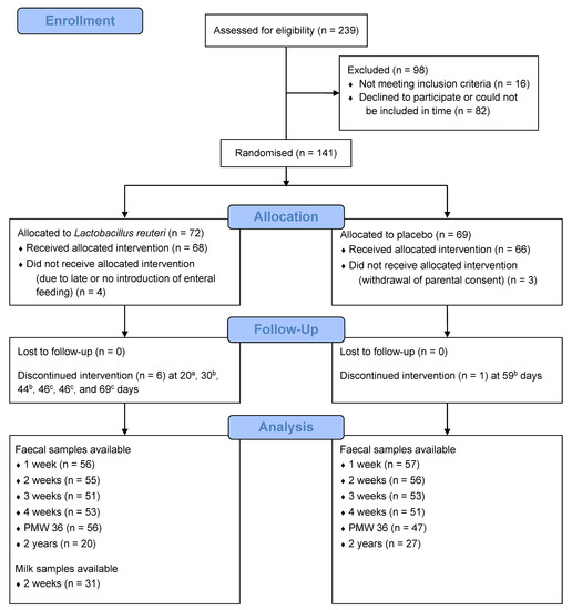 The PROPEL trial was a prospective, randomised, double-blind, placebo-controlled, multi-centre study on the effects of L. reuteri on feeding tolerance, growth, morbidities and mortality in extremely preterm ELBW infants (ClinicalTrials.gov ID NCT01603368). Ethical approvals were given by the Ethics Committee for Human Research in Linköping, Sweden (Dnr 2012/28–31, 22 February 2012; Dnr 2012/433–32, 23 January 2013). Written informed consent was obtained from parents within three days after delivery. A detailed study design has been published [8]. Briefly, the trial included 134 infants born between GW 23 + 0 and 27 + 6 with a birth weight below 1000 g, who were randomised to receive daily oral administration of 1.25 × 108 L. reuteri DSM 17938 (BioGaia AB, Stockholm, Sweden) or a placebo (BioGaia AB) from one to three days postpartum until postmenstrual week (PMW) 36 (Figure 1). L. reuteri DSM 17938 was generated by removal of two resistance gene-carrying plasmids from its mother strain L. reuteri ATCC 55730 [15], which was originally isolated from the breast milk of a Peruvian mother [16]. The probiotic and placebo (maltodextrin) products were provided in oil drops consisting of sunflower oil, medium chain triglyceride oil, and silicon dioxide. The placebo could not be differentiated from the probiotic product by smell, taste, or visual appearance. Study products were administered to ELBW infants via a nasogastric tube or via the infant’s mouth if the nasogastric tube had been removed. Administration of the study products was withheld during periods in which infants were fed nil orally. After administration in the gastric tube, the drops with the study product were flushed down by at least 0.3 mL breast milk. All infants were exclusively fed mother’s own or donor milk until they reached a weight of at least 2000 g.