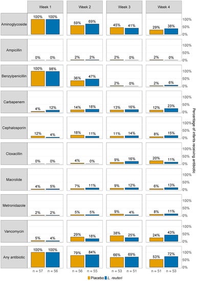 Antibiotic treatment in the L. reuteri-supplemented and placebo group. Bars show antibiotic treatment rates (in %) for placebo (yellow) and L. reuteri-supplemented (blue) extremely preterm ELBW infants, who were treated with the specified antibiotics for at least one day during the first, second, third, and fourth week of life. ELBW = extremely low birth weight.