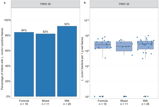 Furthermore, we studied whether infant feeding influenced L. reuteri colonisation. All infants were exclusively fed mother’s own or donor milk until they weighed at least 2000 g, thus investigating the effect of feeding mode on early L. reuteri colonisation was not possible. There was no significant difference in L. reuteri prevalence or abundance in faeces of L. reuteri-supplemented infants at PMW 36 when comparing formula-fed, partially breast milk-fed, and exclusively breast milk-fed infants (Figure 5).