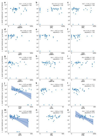 Human milk oligosaccharides and L. reuteri abundance in faeces of the L. reuteri-supplemented group. (a–o) Spearman correlation between human milk oligosaccharide concentrations (µmol/L) in milk collected at two weeks postpartum from exclusively breastfeeding mothers (n = 31) and L. reuteri abundance in faeces at three weeks of age (n = 36) from L. reuteri-supplemented infants. Abundance is shown as the number of L. reuteri bacteria per 1 g wet faeces. For infants with a faecal sample negative for L. reuteri, the number of L. reuteri bacteria per 1 g wet faeces was set to 100. p values were adjusted with the method from Benjamini and Hochberg. DSLNT = disialyl-lacto-N-tetraose, 2′ FL = 2′-fucosyllactose, 3′ FL = 3′-fucosyllactose, LDFT = lacto-difucotetraose, LNDH I = lacto-N-difucohexaose I, LNFP I = lacto-N-fucopentaose I, LNFP II = lacto-N-fucopentaose II, LNFP III = lacto-N-fucopentaose III, LNnT = lacto-N-neotetraose, LNT = lacto-N-tetraose, LSTa = sialyl-lacto-N-tetraose a, LSTb = sialyl-lacto-N-tetraose b, LSTc = sialyl-lacto-N-neotetraose c, 3′ SL = 3′-sialyllactose, 6′ SL = 6′-sialyllactose.