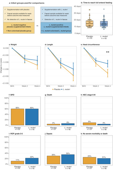 To investigate effects of L. reuteri colonisation on clinical outcomes, L. reuteri-colonised L. reuteri-supplemented infants were compared with non-colonised placebo infants (Figure 7a). L. reuteri-supplemented infants who were colonised with L. reuteri at three weeks of age had better head growth from birth until four weeks of age than non-colonised placebo-supplemented infants (median (95% confidence interval): −1.11 SD (−0.86–−1.35 SD) vs. −1.78 SD (−1.50–−2.06 SD), Figure 7e). Weight and length growth rates, the time to reach full enteral feeding, and incidences of severe morbidities were similar in the two groups (Table S7b–d,f–k). In multivariate models including the potential confounding factor sex and L. reuteri colonisation, female sex was significantly associated with improved length growth until four weeks of age (p = 0.007), and with head growth until two (p = 0.045), and four weeks of age (p = 0.013), while L. reuteri colonisation only affected head growth until four weeks of age (p = 0.003) (Figure S3). Differences in caesarean section frequency between groups did not affect the results.