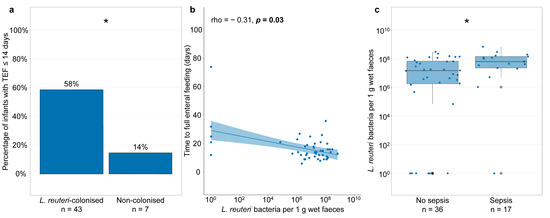 L. reuteri abundance in faeces of the L. reuteri-supplemented group at one week of age and time to full enteral feeding and sepsis. (a) Bars show percentage of infants with a time to full enteral feeding (TEF) below or equal to the group’s median of 14 days in infants of the L. reuteri-supplemented group, who had a faecal sample positive (L. reuteri-colonised) or negative (non-colonised) for L. reuteri at one week of age. (b) Spearman correlation between L. reuteri abundance at one week of age and TEF (expressed in days after birth) in L. reuteri-supplemented infants. (c) L. reuteri abundance in faeces of L. reuteri-supplemented infants at one week of age who later do or do not develop sepsis. Boxplots show median with 25% and 75% percentiles and 1.5× the interquartile range. Infants were excluded if information on TEF was missing (n = 3) or if infants reached full enteral feeding before faecal sampling at one week of age (n = 3) (a,b). For one infant who did not reach full enteral feeding by PMW 36, for graphical display, TEF was set to the day on which the infant reached PMW 36 (74 days) (b). Three infants were excluded because sepsis occurred before faecal sampling at one week of age (c). L. reuteri abundance is shown as the number of L. reuteri bacteria per 1 g wet faeces and, for graphical display, the number of L. reuteri bacteria per 1 g wet faeces was set to 100 for infants with L. reuteri-negative faeces (b,c). Statistics: Fisher’s exact test (a), Mann–Whitney U test (c). * p < 0.05.