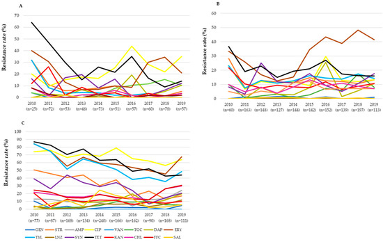 Antimicrobial resistance trend of E. faecalis isolates recovered from cattle (A), pigs (B), and chickens (C) in Korea from 2010 to 2019. Abbreviations: AMP, ampicillin; CIP, ciprofloxacin; CHL, chloramphenicol; DAP, daptomycin; ERY, erythromycin; FFC, florfenicol; GEN, gentamicin; KAN, kanamycin; LIN, linezolid; SAL, salinomycin; STR, streptomycin; TET, tetracycline; TGC, tigecycline, TYL, tylosin; and VAN, vancomycin.