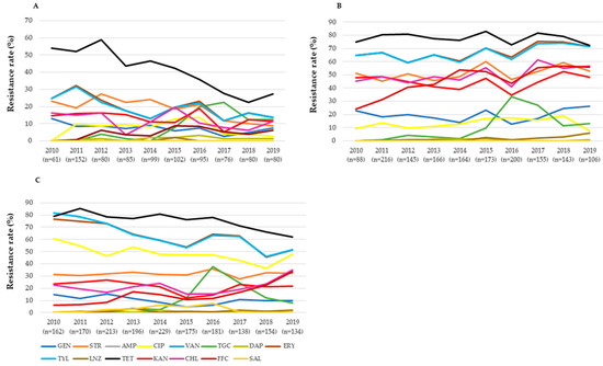 Antimicrobial resistance trend of E. faecium isolates recovered from cattle (A), pigs (B), and chickens (C) in Korea from 2010 to 2019. Abbreviations: AMP, ampicillin; CIP, ciprofloxacin; CHL, chloramphenicol; DAP, daptomycin; ERY, erythromycin; FFC, florfenicol; GEN, gentamicin; KAN, kanamycin; LIN, linezolid; SAL, salinomycin; STR, streptomycin; SYN, quinupristin/dalfopristin; TET, tetracycline; TGC tigecycline, TYL, tylosin; and VAN, vancomycin.