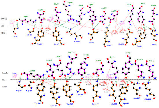 The 3D homology model was constructed based on X-ray structure of SARS-CoV-2 RBD-hACE2 docked complex (PDB ID: 6vw1.1) using Oligomeric modeling implemented in the SWISS-MODEL workspace (http://swissmodel.expasy.org, accessed on 1 April 2021). A global model quality was obtained using the QMEAN scoring functions based on physicochemical properties and the secondary structure was extracted from the 3D structure using DSSP program based on H-bond estimation algorithm [20,21]. In order to evaluate the reliability of predicted 3D structures, additionally, we used RaptorX and HDock servers to reconstruct and compare the molecular structures. Then, the docked structures with the lowest root mean square deviation (RMSD) and highest docking score were selected for further investigation [22,23]. Therefore, the created PDB files were used to infer protein-protein interaction (PPI) in the docked structures of hACE2 and WT or VOC RBD using interacting residue plots generated by the DIMPLOT tool implemented in Ligplot+ v.2.2.4 (EMBL-EBI, Cambridge, UK) [24]. In order to generate Ligplot+ diagrams, Runtime parameters related to the HBPLUS program were adjusted to 4 Å to compute potential H-bonds and non-bonded contacts. However, only interactions with the length of 2.5 Å or less were considered as a strong H-bond [16].