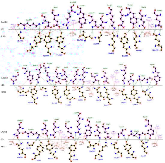 Interacting amino acids between (A) WT RBD-hACE-2; (B) UK-VOC RBD-hACE-2; (C) SA-VOC-RBD-hACE-2; (D) COH-VOC-RBD-hACE-2; (E) BR-VOC-RBD-hACE-2. The models were analyzed for interactions using DIMPLOT tool implemented in Ligplot+ v.2.2.4. The H-bond/salt-bridge and hydrophobic interactions are shown with green and red dots, respectively.