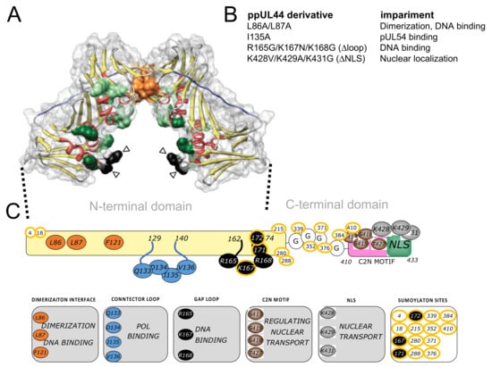 ppUL44 structure, functional domains and key residues. (A) The crystal structure of pUL44 (1–290; pdb code: 1T6L) is shown as ribbons with transparent surface (red, α-helices; yellow, β-sheets). Key residues involved in dimerization (orange), DNA binding (green), as well as those located within the connector (blue) or gap (black) loops are shown in color. Empty arrowheads indicate residues that are not visible in the electron density map. Copyright © American Society for Microbiology, Journal of Virology, 83, 9567–9576, 2009. (B) List of ppUL44 substitution derivative tests in this study, along with their defects as compared to the wild-type protein. (C) Schematic representation of ppUL44 functional domains with highlighted residues involved in specific functions. Residues involved in dimerization are in orange, the connector loop is in blue, the gap loop is in black. The C2N motif is in pink, the nuclear localization signal (NLS) in cyan with key residues in brown and grey, respectively. Sumoylated residues have a yellow outline.