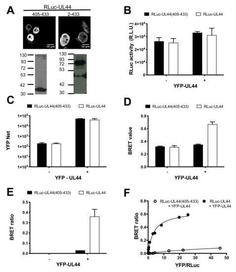 Bioluminescence resonant energy transfer (BRET) analysis of UL44 self-interaction in living cells. HEK293T cells were transfected to transiently express either RLuc-UL44(2–433) or RLuc-UL44(405–433), either in the absence or in the presence of YFP-UL44; 48 h later cells were processed for immunofluorescence and Western blotting (A) or BRET measurements (B–F) as described in the Materials and Methods section. (A) Subcellular localization and molecular weight of Renilla luciferase (RLuc)-fusion proteins was assessed using a mouse monoclonal antibody against RLuc. For BRET assays, RLuc activity (B) and YFP fluorescence (C) were measured, and the BRET value (D) and BRET ratio (E) were calculated. Representative data from two independent experiments performed in triplicate are shown. (F). The BRET ratio relative to indicated BRET pairs is plotted against the ratio between YFPnet and RLuc emission as described in the Materials and Methods section. Representative data from two independent experiments performed in triplicate are shown.