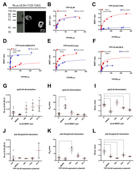 The same approach was then used to study the effect of specific ppUL44 substitutions on homodimerization and pUL54 binding. In addition to the dimerization interface substitution derivative ppUL44-L86A/L87A and the connector loop substitution derivative ppUL44-I135A, the ppUL44 flexible gap loop substitution derivative ppUL44Δloop, impaired for DNA binding but neither for ppUL44 dimerization nor for pUL54 binding, and ppUL44ΔNLS, impaired for nuclear translocation, were also included (see Figure 1 for schematic representation). To allow proper comparison between the different ppUL44 derivatives, appropriate transfection conditions for each BRET pair were established, resulting in similar RLuc-fusion expression levels both when investigating ppUL44 dimerization (Figure 4G) and its interaction with pUL54 (Figure 4J). Importantly, substitutions at the ppUL44 dimerization interface (L86A/L87A) significantly increased the B50 value relative to ppUL44 dimerization (Figure 4D,H; p = 0.0020) but not that relative to binding to pUL54 (Figure 4D,K). On the other hand, the I135A substitution significantly increased the B50 value relative to binding to pUL54 (Figure 4C,K; p = 0.0321) but not that relative to ppUL44 dimerization (Figure 4C,H). These two observations further confirm that distinct and independent ppUL44 residues are involved in the two processes. Importantly, the Δloop (Figure 4E) and ΔNLS (Figure 4F) substitutions did not significantly affect the B50 relative to either interaction (Figure 4H,K), further confirming that holoenzyme formation can occur in the absence of dsDNA, and suggesting that dsDNA binding does not influence the affinity between ppUL44 and pUL54 (see Figure 4E and Table 1). However, both the L86A/L87A and the Δloop substitutions significantly decreased the Bmax values relative to both ppUL44 dimerization and pUL54/ppUL44 interaction (Figure 4D,E,I,L) implying the possibility that DNA binding influences the conformation of both ppUL44 homodimers and of the holoenzyme complex.