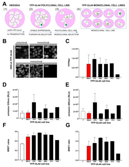 2.9. Generation of Polyclonal and Monoclonal HEK293A Cells Stably Expressing YFP-UL44 and Either Rluc-NLS[G] or Rluc-UL44