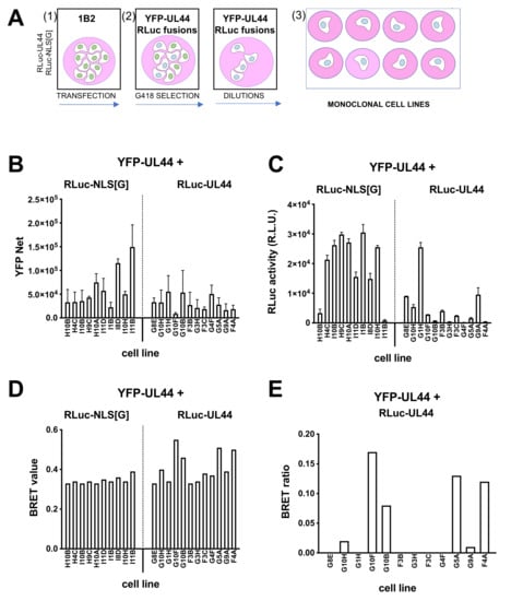 Establishment of and monoclonal cell lines stably expressing YFP-UL44 and different levels of RLuc-UL44 for BRET assays. (A) 1B2 monoclonal cell line was transfected (1) with either pDESTnRLuc-UL44 or pDESTnRLuc-NLS[G], and starting 48 h later, selected with G418 (2) and seeded at 0.5 cells/well in 96-well plates to generate monoclonal cell lines stably expressing both RLuc- and YFP-UL44 (3). YFP expression was evaluated by fluorescent emission (B), and, upon addition of coelenterazine, all cell lines were tested in BRET assays to quantify RLuc expression (C), allowing to calculate their respective BRET values (D) and BRET ratios (E).