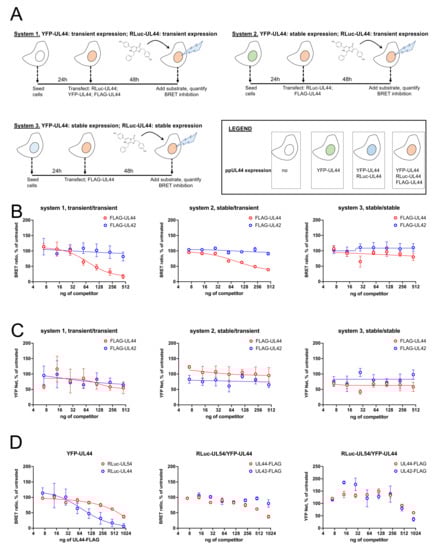 We then compared the effect of FLAG-UL44, and of the non-interacting FLAG-UL42 fusion proteins on the BRET signal originated by expression of RLuc-UL44 and YFP-UL44 using the three different systems mentioned above (Figure 7A). Therefore HEK293T, 1B2 and G10F cells were transiently transfected with plasmids encoding for either RLuc-UL44 and YFP-UL44, RLuc-UL44 or pCDNA3, respectively, in the presence of increasing concentrations of plasmids pDESTnFLAG-UL44 or pDESTnFLAG-UL42 (Figure 7A). Interestingly, transfection with pDESTnFLAG-UL44, but not pDESTnFLAG-UL42, resulted in a concentration-dependent decrease in the BRET signal when RLuc-UL44 was transiently expressed and YFP-UL44 was either transiently (system 1, Figure 7B, left panel) or stably expressed (system 2, Figure 7B, middle panel). BRET inhibition did not depend on the reduction of YFP-UL44 expression levels (Figure 7C, compare data for FLAG-UL44 and FLAG-UL42). However, when both RLuc-UL44 and YFP-UL44 were stably expressed before transfection with pDESTnFLAG-UL44 (system 3, Figure 7B, right panel), no inhibition of BRET signal was detected. We therefore applied a transient expression approach to perturb the BRET signal relative to the ppUL44/pUL54 interaction. To this end, we transiently transfected HEK293T cells with fixed amounts of pDESTnRLuc-UL54 and pDESTnYFP-UL44 and increasing concentrations of pDESTnFLAG-UL44 or pDESTnFLAG-UL42 as a control (Figure 7C). Our data revealed that overexpression of FLAG-UL44 could also inhibit, although less efficiently, the BRET signal generated from the RLuc-UL54/YFP-UL44. Indeed, transfection with up to 900 ng of pDESTnFLAG resulted in about 40% inhibition, as compared to >90% inhibition relative to RLuc-UL44/YFP-UL44 (Figure 7D, left panel). In this case, no significant inhibition was observed upon overexpression of the unrelated FLAG-UL42 fusion protein (Figure 7D, middle panel), and inhibition was not dependent on reduction of the YFP-UL44 expression levels (Figure 7D, right panel).