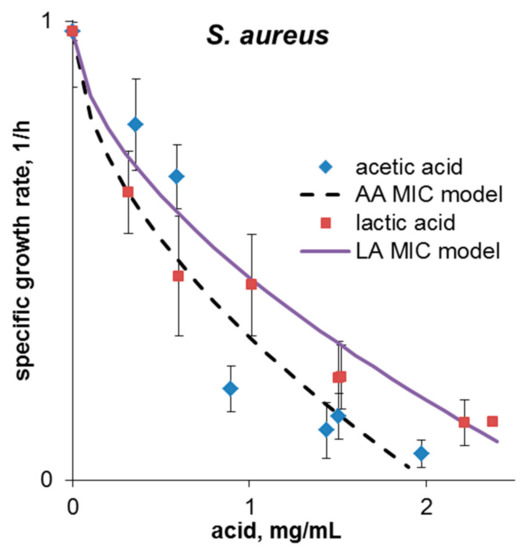 The fermentation of S. aureus monoculture has been developed at the mentioned conditions with the addition of different quantities of one of the acids (lactic acid or acetic acid). The specific growth rate was determined for each concentration of each acid by estimating the line of best fit. The constants of Equation (2) were calculated using regression analysis for the modification of Equation (2):