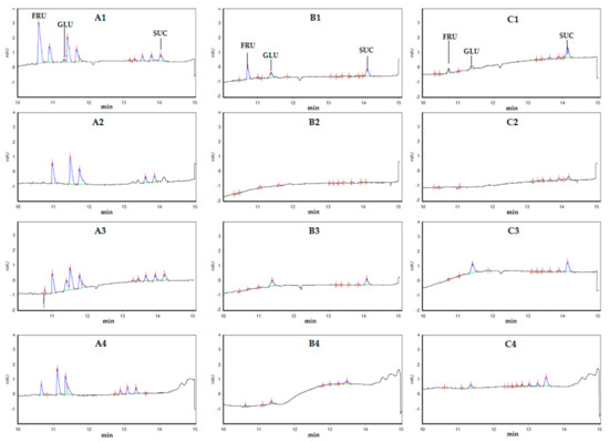 Electropherograms of FOS (A), Burd-20 (B) or JA-20 (C) samples; medium before inoculation (1) and cultural fluid after 8 h of fermentation of S. aureus monoculture (2), B. bifidum monoculture (3), and coculture (4). Standards were fructose (FRU), glucose (GLU), and sucrose (SUC). The left group of peaks is suggested to correspond to pure fructose oligomers and the right one to glucose-containing FOS.