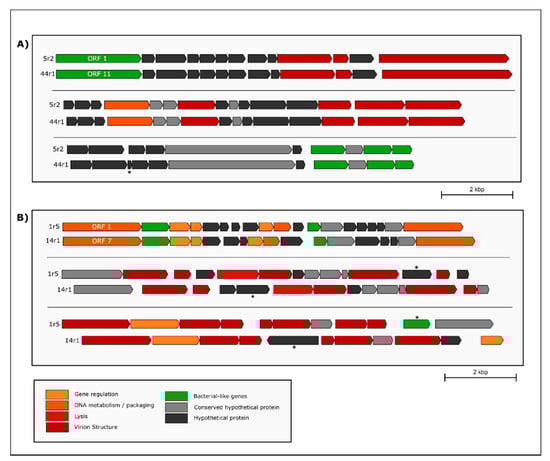 Comparative map of SRP prophages with a high level of synteny. (A) Fragment of high synteny between the prophages 5r2 (Desulfovibrio aespoeensis Aspo-2) and 44r1 (Desulfovibrio alaskensis G20), which contain a high prevalence of hypothetical proteins. (B) Fragment of high synteny between prophages 1r5 (Desulfovibrio vulgaris str. Hildenborough) and 14r1 (Desulfovibrio vulgaris str. Miyazaki). The asterisks indicate those ORFs not shared by both prophages. Annotation was made by Diamond and DNA Master.