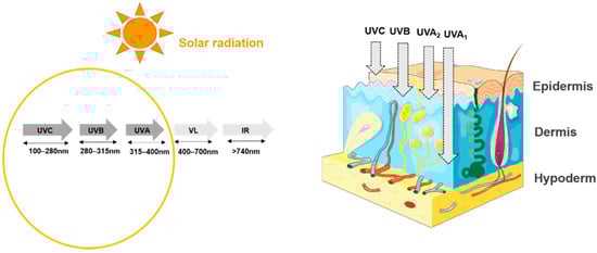 The effects of UV radiation on the skin differ depending on their energy and potential for penetration (Figure 2). The longer the radiation wavelength is, the deeper it will penetrate into the skin. UVC is efficiently absorbed by ozone in the stratosphere. At sea level, humans are mainly exposed to UVB and UVA. According to the literature, UVs that penetrate the skin represent 5 to 8% of sunlight radiation corresponding to approximately 5–10% UVB and 90–95% UVA [38,39,40,41]. These values vary with the sun elevation, altitude, ozone, cloud covering and ground reflection. Pollution and stratospheric ozone layer depletion can, however, magnify ultraviolet radiation exposure values [37].