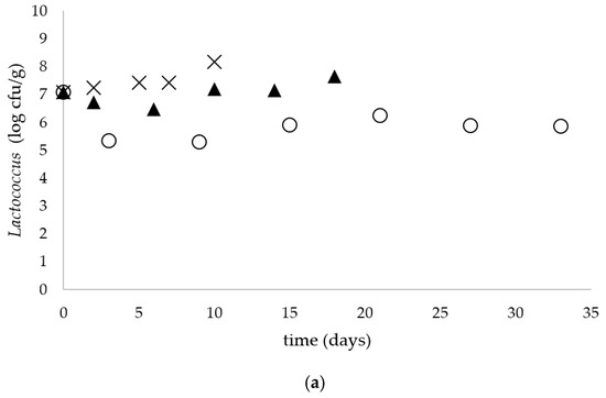 Lactococcus concentration throughout the whole experiment was in a range from 5.8 to 8.2 log cfu/g. Yoon et al. (2016) observed a growth inhibition of foodborne pathogens by native lactobacilli, lactococci and enterococci by production of bacteriocins and other antimicrobial substances, e.g., hydrogen peroxide and organic acids [