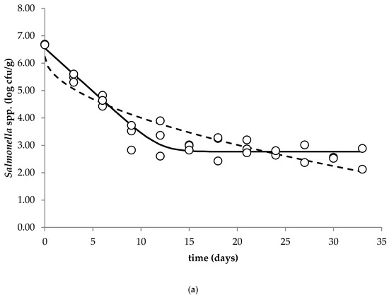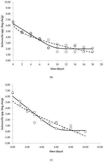 The bacterial-count points transformed to log10 values were plotted against time (in days) in MS Excel v. 2010 (Microsoft). The following mathematical functions were used as primary models in order to determine the survival kinetics of Salmonella spp. in unripened soft cheese made from raw milk: