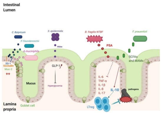 | Microbial Anti-Inflammatory molecules (MAMs) | F. prausnitzii | Colitis | Have anti-inflammatory properties | [84] |