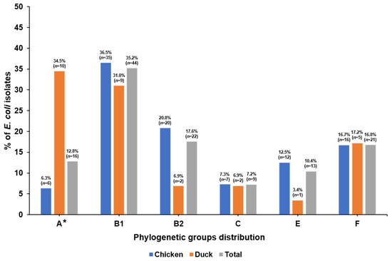 Distribution of phylogenetic groups among 125 APEC isolates. *: significant difference (p < 0.05) between chicken and duck isolates.