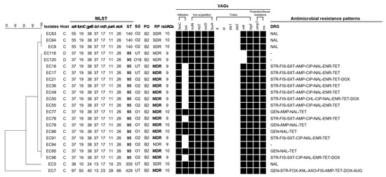 A total of 22 isolates belonging to phylogenetic group B2 were subjected to MLST analysis to delineate their clonal relationships. MLST was performed based on seven housekeeping genes (adk, fumC, gyrB, icd, mdh, purA, and recA), as described previously [57]. The allelic number and corresponding sequencing type (ST) number were designated according to the scheme on the E. coli MLST website (http://enterobase.warwick.ac.uk/species/index/ecoli, accessed on 14 February 2021). A dendrogram for visualizing genomic relations among 22 isolates was generated using BioNumerics v. 6.0 (Applied Maths, Sint-Martens-Latem, Belgium) based on joint analysis of the seven housekeeping genes.