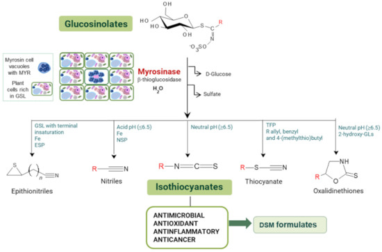 More than 130 GSL structures have been discovered and validated to date, and they may be classified in aliphatic, aryl aliphatic, or indolic GSLs in function of the variable side chain structure [40,41]. A single GSL is often dominant in brassica plants and their GSL quali–quantitative composition largely depends on the plant genotype, growth stage, the cultivation conditions, and the plant organ, even if GSLs are often particularly concentrated in seeds [42]. GSLs consistently occur in plants, in conjunction with the hydrolytic enzyme ¦Â-thioglucosidase, MYR, (E.C. 3.2.1.147). Upon biotic or abiotic lesions and physical disruption of the plant cell, GSL and MYR come into contact, triggering, in the presence of water, the hydrolysis reaction that releases a broad range of degradation compounds [43]. The isothiocyanates (ITCs) are the main products formed at neutral pH, but other compounds could form in function of several factors as substrate structure, reaction conditions, and the presence of specifier proteins (Figure 1).