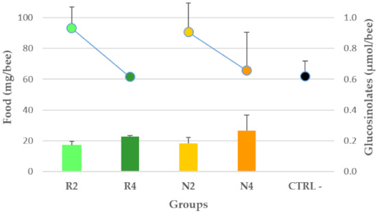Cumulative individual food daily consumption of N. ceranae-infected treated groups (R2, R4, N2, N4) and CTRL−, expressed as mg/bee (dots—left y-axis), and relative cumulative individual GSL intake, expressed as ¦μmol/bees (columns–right y-axis), at 8 days post-infection. Vertical bars indicate the standard deviation.
