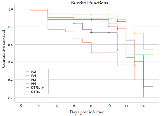 Kaplan–Meier survivorship curves for the N. ceranae-infected treated groups (R2, R4, N2, N4), CTRL+ and CTRL−. Crosses indicate right-censored observations (cens.).