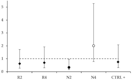 Hazard ratios represented along with the respective confidence interval for each experimental N. ceranae-infected treated group (R2, R4, N2, N4) and CTRL+. The CTRL− served as the reference group. The dotted line indicates HR = 1. Significantly lower, higher, and non-significant HR values are, respectively, indicated by a black circle, white circle, and diamonds.