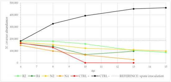 Variation in the N. ceranae copies across the timeline in the different treated groups (R2, R4, N2, N4), CTRL+ and CTRL−.