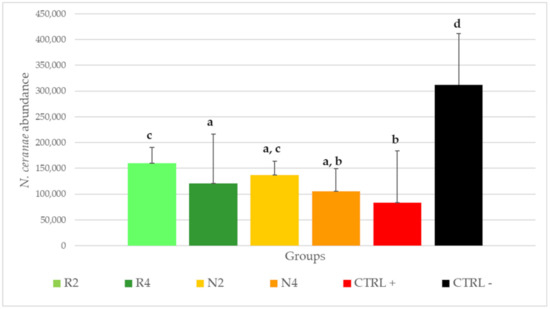 Average N. ceranae abundance copies calculated for the different levels of the factor ‘treatment’, for treated groups (R2, R4, N2, N4), CTRL+ and CTRL−. Standard deviations are shown as vertical bars. Same letters indicate no significant differences (Newman-Keuls post-hoc test; p = 0.05).