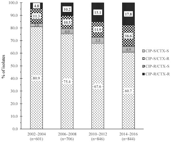 A total of 2997 outpatient urine E. coli isolates were in the TSAR biennial collection from 2002 to 2016 with over 600 isolates in each study period. Among the 2997 isolates, 380 (12.7%) were CIP-R/CTX-R, 383 (12.8%) were CIP-R/CTX-S, 130 (4.3%) were CIP-S/CTX-R, and 2104 (70.2%) were CIP-S/CTX-S (based on 2018 CLSI breakpoints. Isolates with intermediate results are grouped in the resistance category due to the fewer number of those isolates). However, a steady increase of isolates that were CIP-R/CTX-R occurred over time, from 4.8% in 2002–2004 to 17.8% in 2004–2016 (p < 0.01) with a concurrent decrease of CIP-S/CTX-S isolates (Figure 1). CIP-R/CTX-S isolates comprised similar percentages (~11%) before 2012 but increased to 16.6% in 2014–2016. There were no significant changes in the proportion of CIP-S/CTX-R isolates over the years. Not surprisingly, isolates of the CIP-R/CTX-R and CIP-S/CTX-R groups had the lowest rates of susceptibility to other β-lactam agents. Among these two CTX-R groups, the CIP-R isolates had the lowest rates of susceptibility to aztreonam, cefepime, gentamicin, and trimethoprim/sulfamethoxazole. In the CTX-S groups, the CIP-R isolates also had lower rates of susceptibility to ampicillin, cefoxitin, gentamicin, and trimethoprim/sulfamethoxazole (Table 1).