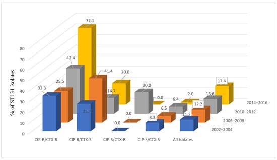 Using data on the number of total and CIP-R/CTX-R, CIP-R/CTX-S, CIP-S/CTX-R, and CIP-S/CTX-S group isolates in each study period in Figure 1, plus the percentages of ST131 obtained in the tested isolates from each CIP/CTX group in Figure 2, we calculated the prevalence of ST131 in outpatient UTI E. coli in each study period. For example, among the 844 isolates in 2014–2016, 151 (17.9%), 140 (16.5%), 41 (4.9%), and 512 (60.7%) had CIP-R/CTX-R, CIP-R/CTX-S, CIP-S/CTX-R, and CIP-S/CTX-S phenotype, respectively; and the percentage of ST131 in the tested isolates of each group was 72.1%, 20.0%, 0%, and 2.0%, respectively. The estimated ST131 prevalence in E. coli in this cohort of isolates is 13.9% overall (2002 to 2016) and 17.4% in 2014–2016, which was a significant increase (p < 0.01) from the estimated prevalence of 11.2% in 2002–2004, 12.2% in 2006–2008, and 13.6% in 2010–2012.