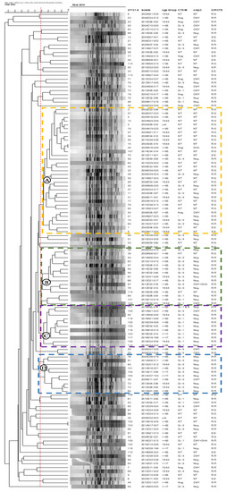 PFGE was performed on the ST131 isolates to look for strain relatedness in isolates from different years and hospitals (Figure 3). Among the 125 isolates, four main clusters (isolates with ≥80% similarity) predominated, including 33 isolates in cluster A, 15 isolates in cluster B, 11 isolates in cluster C, and 10 isolates in cluster D (Figure 3). These isolates are from different periods, geographic regions, and hospitals. The 4 clusters also shared ≥75% in similarity. All but one of the 33 isolates in cluster A are from 2002–2012, and the majority (22 isolates) of them were CIP-R/CTX-S. Cluster A isolates also contain 8 CIP-R/CTX-R isolates, 7 of which carried Gr. 9 CTX-M type ESBL. In contrast, in the 36 isolates belonging to clusters B, C, and D, all but 2 were CIP-R/CTX-R, and most are from 2014–2016, but Gr. 9 CTX-M predominated in cluster B, Gr. 1 CTX-M in cluster C, and all cluster D isolates carried Gr. 9 CTX-M. Isolates outside of these 4 clusters are mostly diverse in their CIP/CTX susceptibility phenotype.