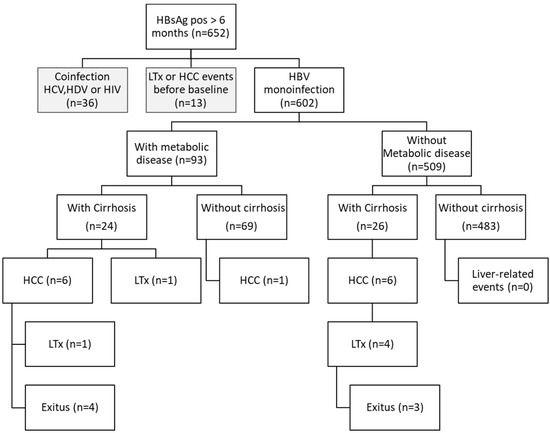 Patient outcome of chronic hepatitis B patients with and without metabolic diseases. Liver-related events included exitus letalis, hepatocellular carcinoma and liver transplantation. HBsAg = hepatitis B surface antigen, HCV = hepatitis C virus, HDV = hepatitis D virus, HIV = human immunodeficiency virus, HCC = hepatocellular carcinoma, LTx = liver transplantation.