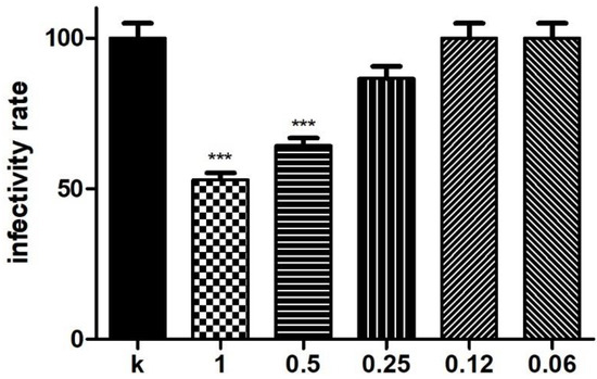 BS isolated from L. crispatus BC1 displayed a significant killing activity against CT EBs (5 × 103 EBs) for concentrations of 1 and 0.5 mg/mL after 60 min of incubation, as shown in Figure 1. Raw quantitative data on chlamydial IFU number, as well as images of HeLa monolayers infected with CT in the different experimental conditions, are shown in Supplementary Figure S1 and Table S1. Higher BS concentrations have not been tested against CT, considering the cytotoxic effect of BS on HeLa cells already demonstrated by De Gregorio et al. [25]. No inhibitory effect after 7 min of contact was noticed (data not shown). As expected, BS solutions maintained pH values of 7.0, thus excluding a killing effect due to an acidic milieu.