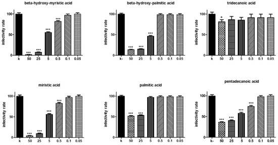 The same fatty acids tested on CT infectivity were also analyzed for their toxicity on cervical epithelial cells by MTT assay (Figure 3). β-hydroxy-myristic acid, miristic acid, tridecanoic acid, and pentadecanoic acid did not affect cell viability at concentrations up to 50 µg/mL. In contrast, palmitic acid and the corresponding hydroxylated form significantly decreased HeLa cells’ viability at the highest tested doses. In particular, 50 µg/mL β-hydroxy-palmitic acid reduced cell viability by 59.41%, whereas the same dose of palmitic acid reduced cell viability by 23.44%. β-hydroxy-palmitic acid induced a significant decrease of cell viability (48.71%) also when administered at 25 µg/mL. Vehicle molecule (DMSO) did not show any cytotoxic effect at the tested doses (data not shown).